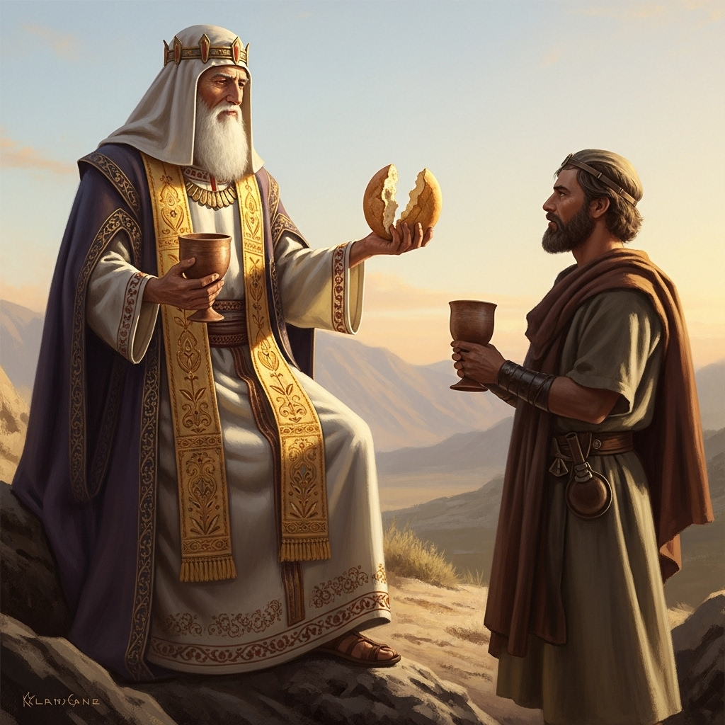 Amid his many roles, priest, king, teacher. Melchizedek is most famously remembered for his encounter with Abram of Ur, later called Abraham. After Abraham’s victory in the rescue of his nephew Lot, he was met by this mysterious figure, “king of Salem” and “priest of the Highest God.” Melchizedek brought forth bread and wine, gifts of simple yet profound symbolism. He broke the bread, blessed it, and commanded Abraham to eat. He blessed the wine, a sign of joy and covenant fellowship. He pronounced a blessing over Abram himself: “Blessed Abram, thou art a man of the Highest Elohim, possessor of heaven and of earth; and blessed is the name of the Most High Elohim, which hath delivered thine enemies into thine hand.”
